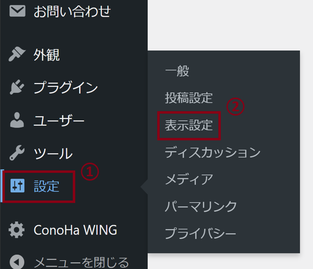 左側のメニューから ①「設定」→②「表示設定」 をクリック! ちょっと下の方にあるので、スクロールして探してね(^^)
