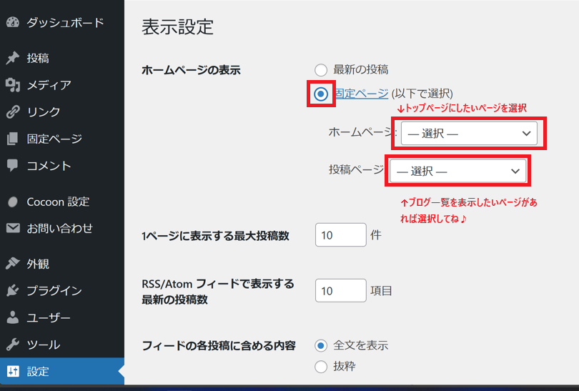 🛠 ステップ③:「ホームページの表示」を固定ページにチェンジ!